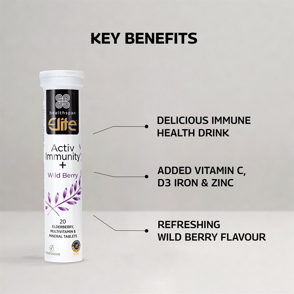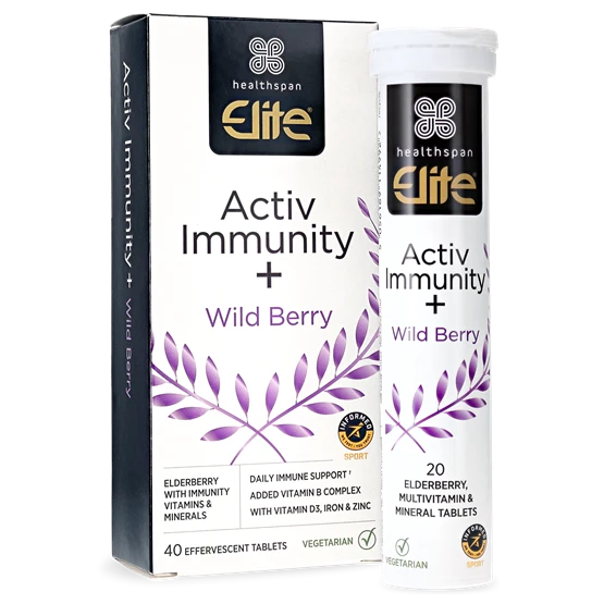 Activ Immunity + has been formulated to provide advanced daily nutrition support to support your immune system. Each tablet dissolves quickly in water to provide a delicious wild berry flavoured drink and contains 500 mg of the superfruit elderberry and 500 mg of vitamin C , widely known for its immune supporting benefits, particularly after periods of intense exercise.