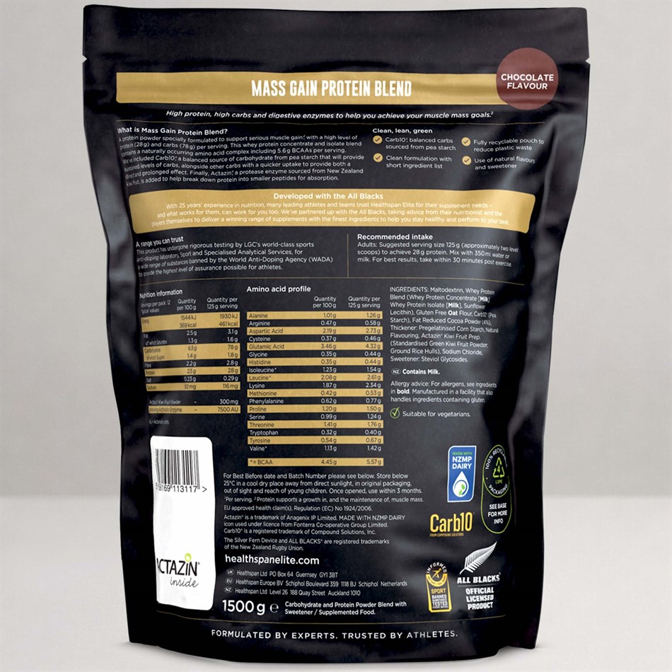 It was important for us and the All Blacks to launch a range that shared our mutual values. This led to the ‘clean, lean, green’ ethos: our Mass Gain Protein is Informed Sport approved and contains natural flavours (Clean), with a science−backed formulation to help you achieve your goals (Lean), within a fully recyclable pouch to help reduce plastic waste (Green).