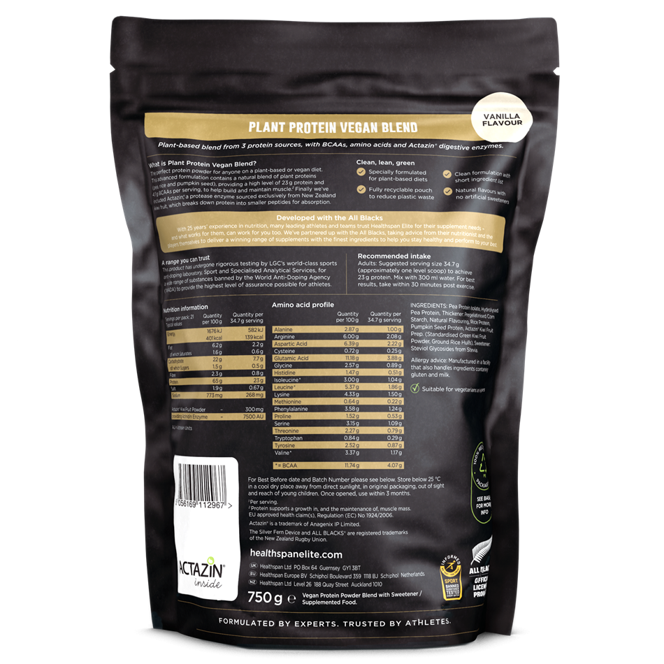 The perfect protein powder for anyone following a vegan or plant−based diet and wanting to build and maintain muscle.* Plant Protein Vegan Blend is an advanced formulation containing a natural blend of plant proteins (pea, rice and pumpkin seed), providing a high level of 24 g protein and 4.1 g BCAAs per serving. We’ve also added Actazin®, a protease enzyme sourced from New Zealand kiwi fruit, which breaks down protein into smaller peptides for better absorption in the body. With a luxurious natural Vanilla flavour, our Plant Protein Vegan Blend tastes great and is easy to mix. It’s also low in sugar and contains no artificial sweeteners – we use Stevia, a natural alternative.