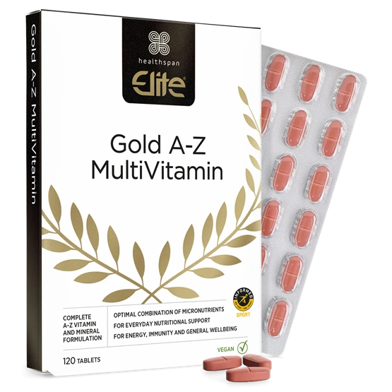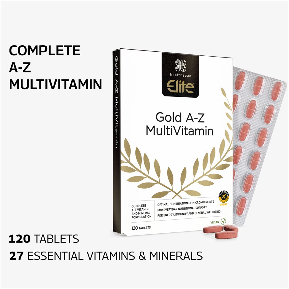 Achieving all the vitamins and minerals our bodies need on a daily basis is important for everyone, but more so for highly active people whose nutrient needs are increased. Gold A−Z MultiVitamin is a daily multi−spectrum multivitamin and mineral tablet, providing high levels of several essential vitamins and minerals as well as important micronutrients.