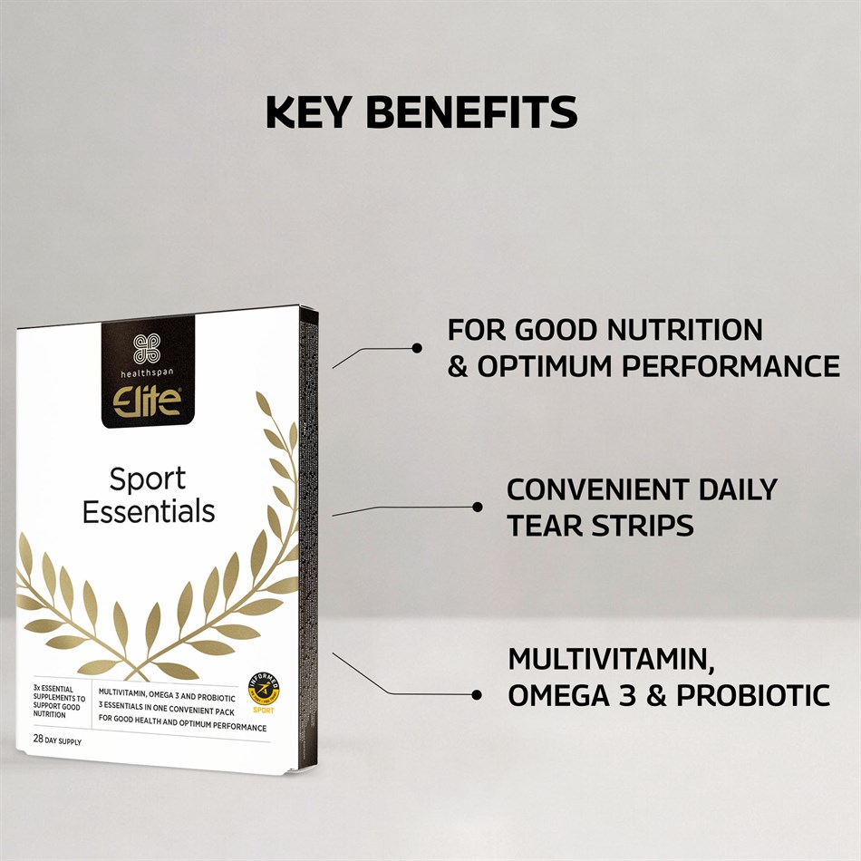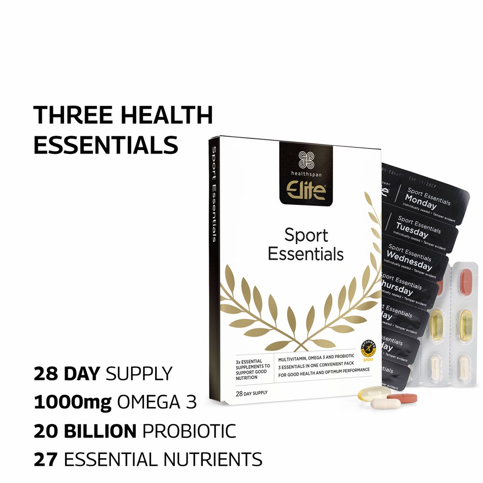 Sport Essentials contain a high strength omega 3 providing high levels of the beneficial fatty acids DHA and EPA, a full spectrum multivitamin and a probiotic packed with 20 billion ‘friendly’ live bacteria, all in handy daily tear strips for convenience.
