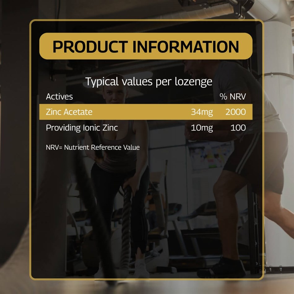 - Each lozenge contains 34mg of zinc acetate, which delivers 10mg active ionic zinc